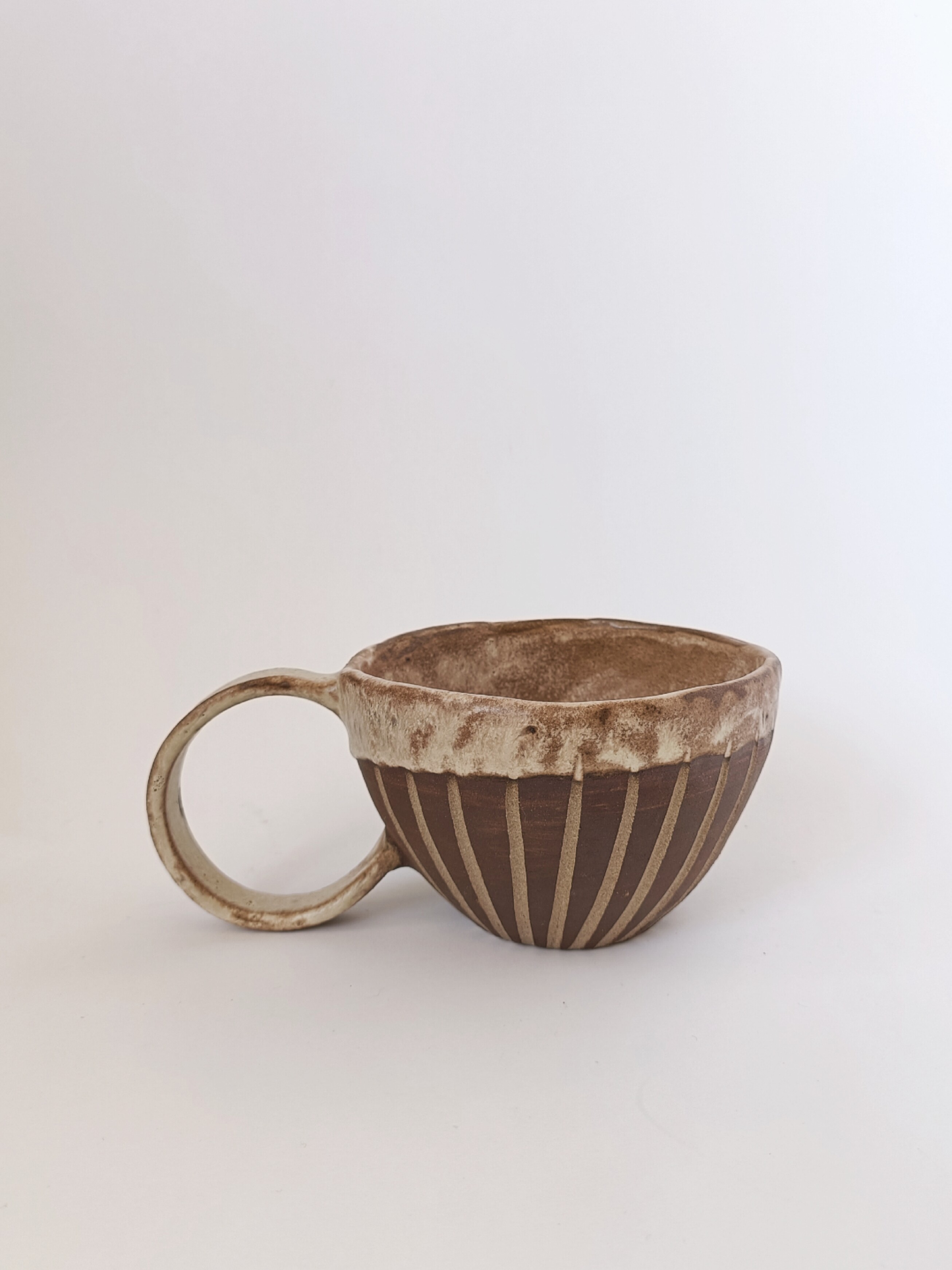 Filiżanka o pojemności 430 ml. Ulepiona ręcznie z gliny kamionkowej, pokryta szkliwem dopuszczonym do kontaktu z żywnością, w wykończeniu matowym. Na zewnątrz kubka surowe, matowe zdobienie angobą w technice sgraffito.
