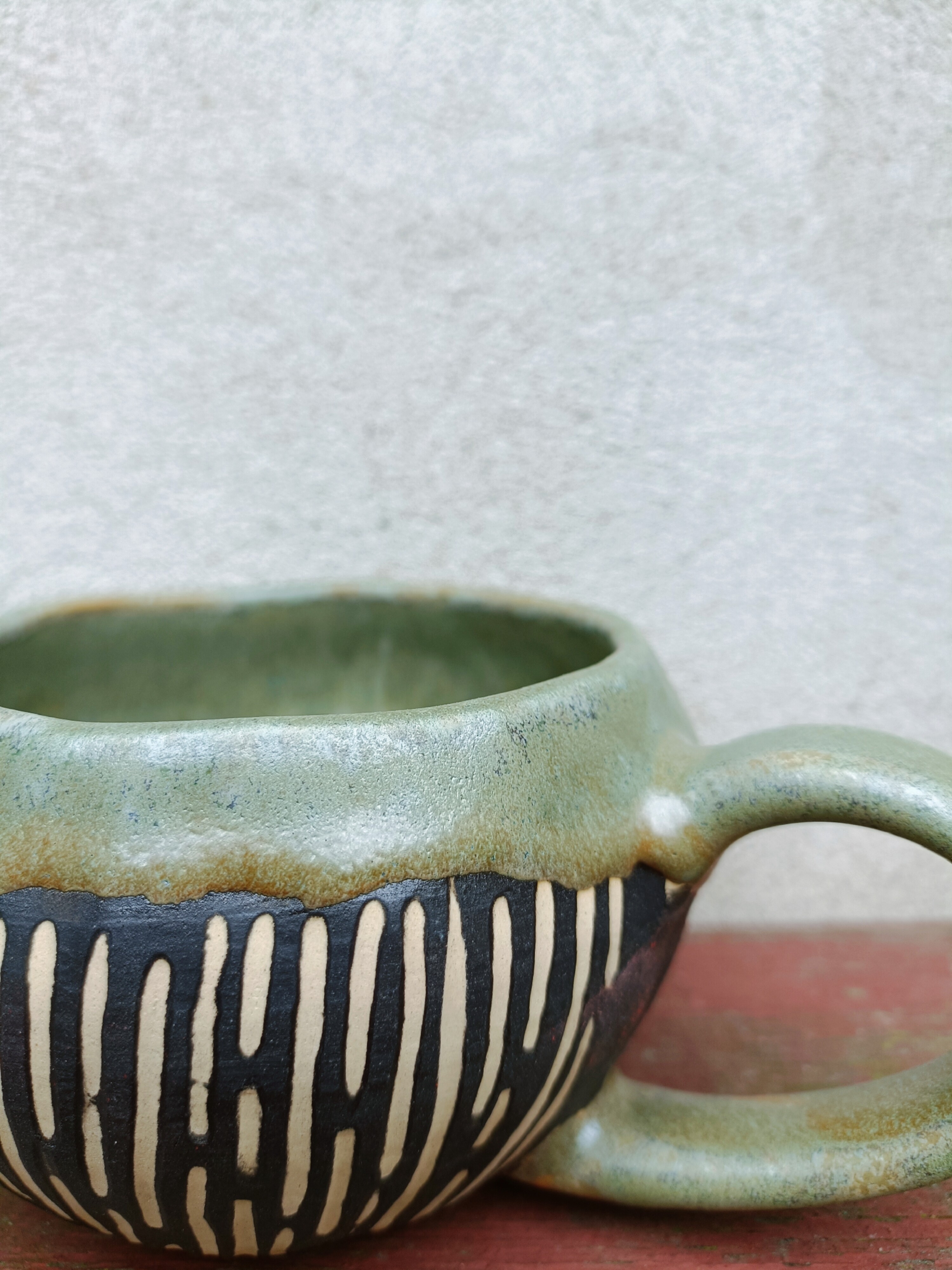Filiżanka o pojemności 385 ml. Ulepiona ręcznie z gliny kamionkowej, pokryta szkliwem dopuszczonym do kontaktu z żywnością w wykończeniu satynowym. Na zewnątrz kubka surowe, matowe zdobienie angobą w technice sgraffito.