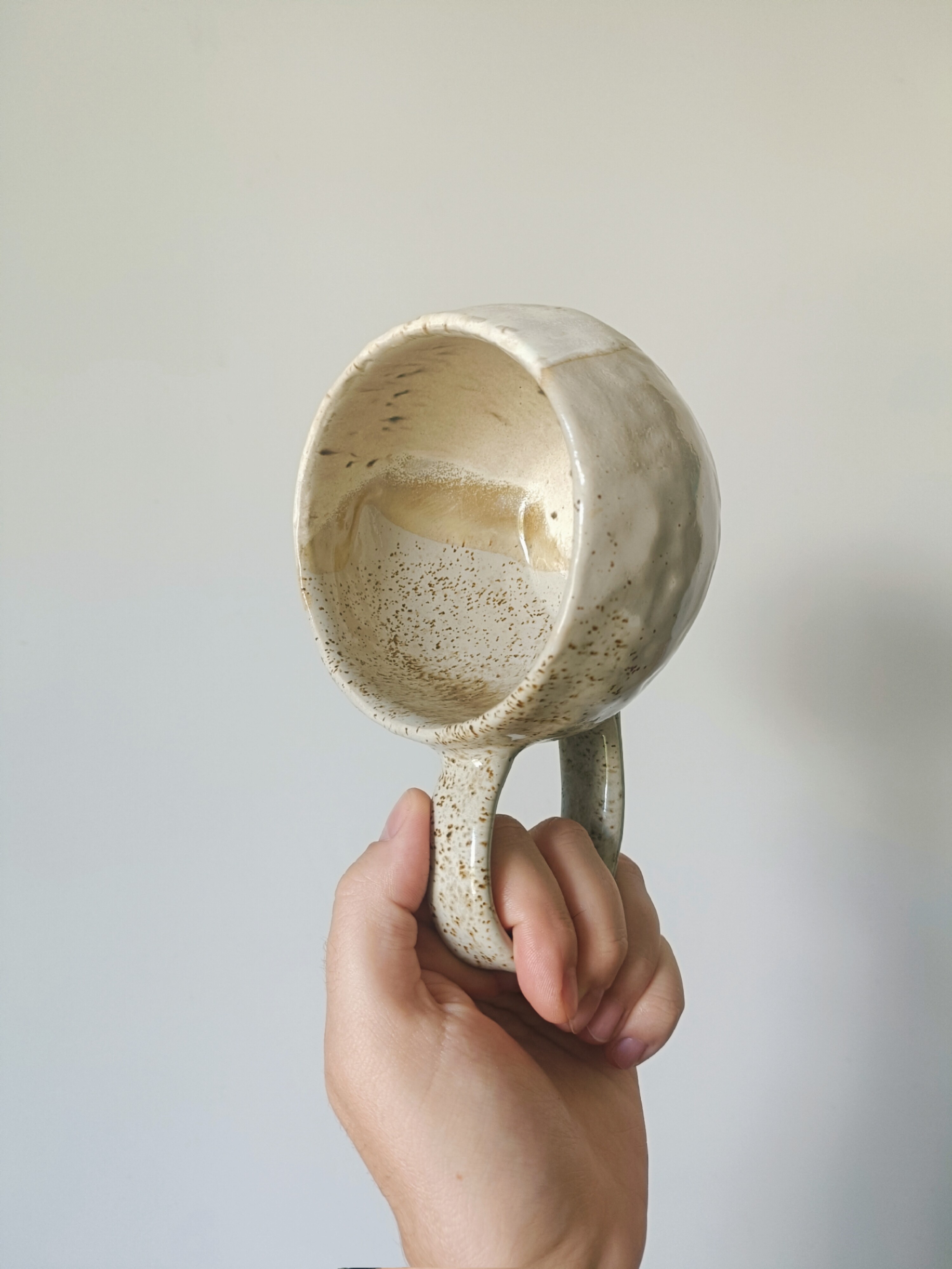 Kubek o pojemności maksymalnej 400ml. Ulepiony ręcznie z gliny kamionkowej, szkliwiony szkliwami dopuszczonymi do kontaktu z żywnością. Po stronie ucha szkliwo błyszczące, nakrapiane. Po stronie przeciwnej do ucha szkliwo matowe, nakrapiane.