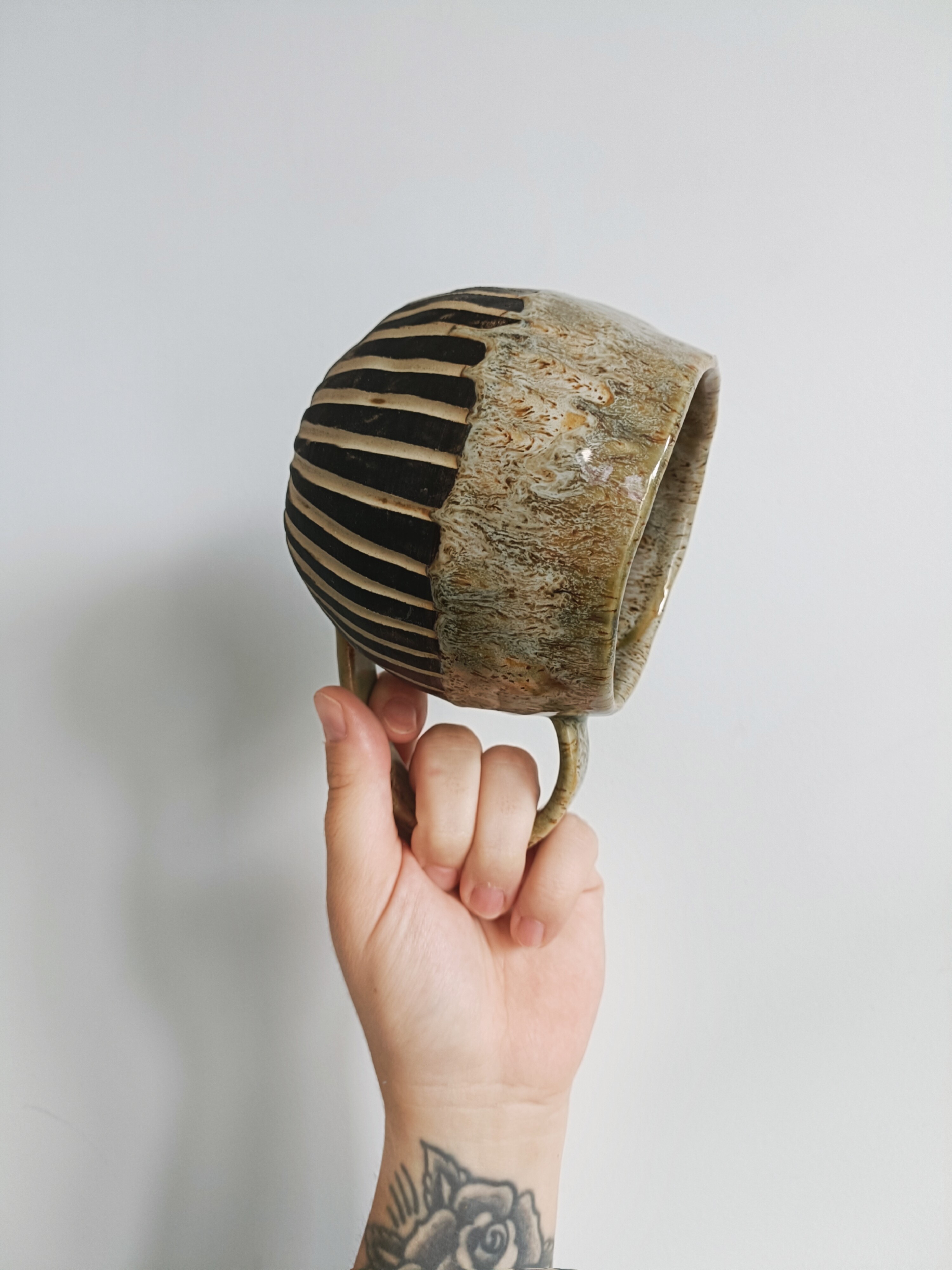 Kubek o pojemności maksymalnej 580 ml. Ulepiony ręcznie z gliny kamionkowej, pokryty szkliwem dopuszczonym do kontaktu z żywnością w wykończeniu błyszcząco satynowym. Na zewnątrz kubka surowe, matowe zdobienie angobą w technice sgraffito.