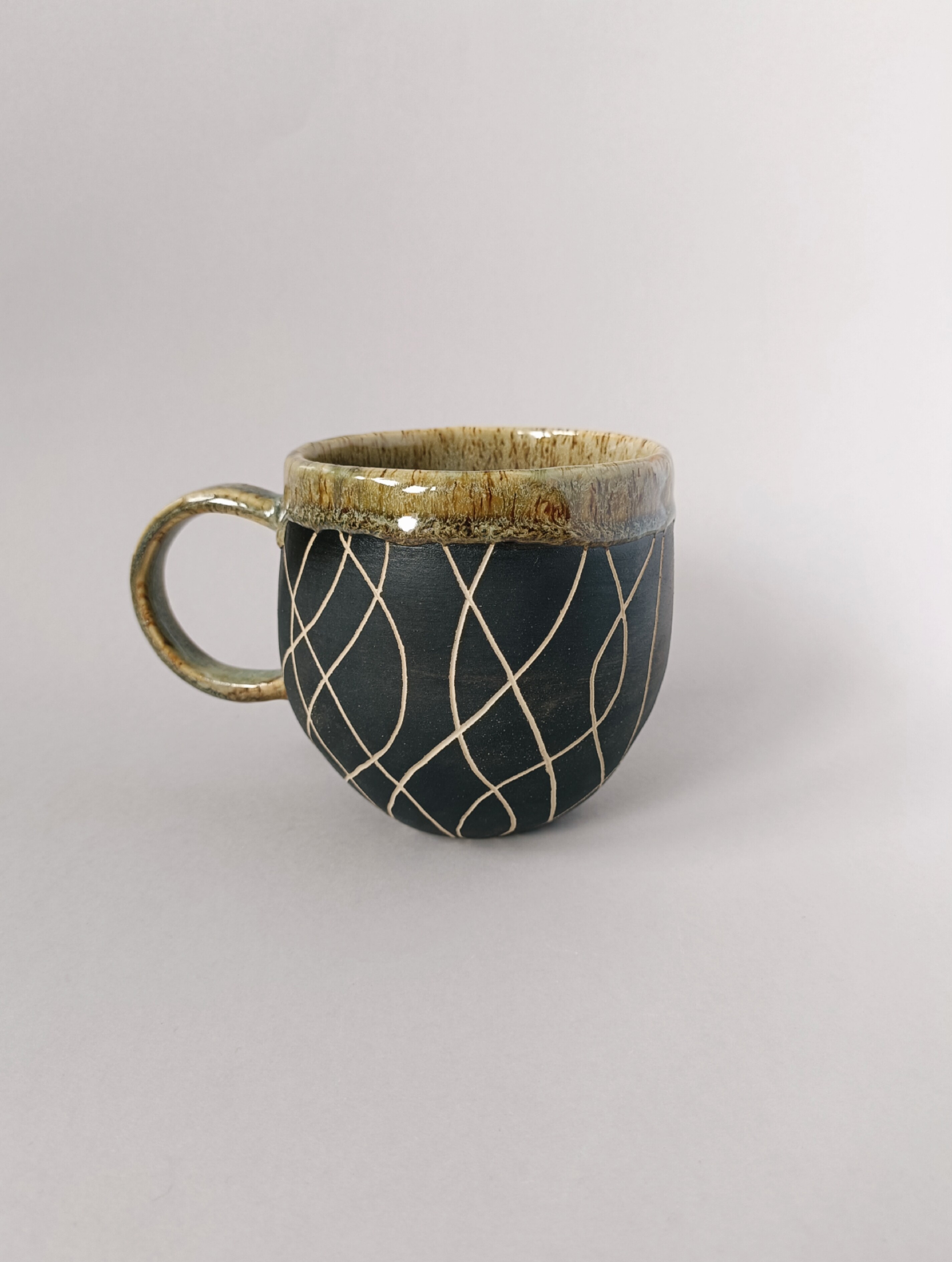 Kubek o pojemności maksymalnej 590 ml. Ulepiony ręcznie z gliny kamionkowej, pokryty szkliwem dopuszczonym do kontaktu z żywnością w wykończeniu błyszcząco satynowym. Na zewnątrz kubka surowe, matowe zdobienie angobą w technice sgraffito.