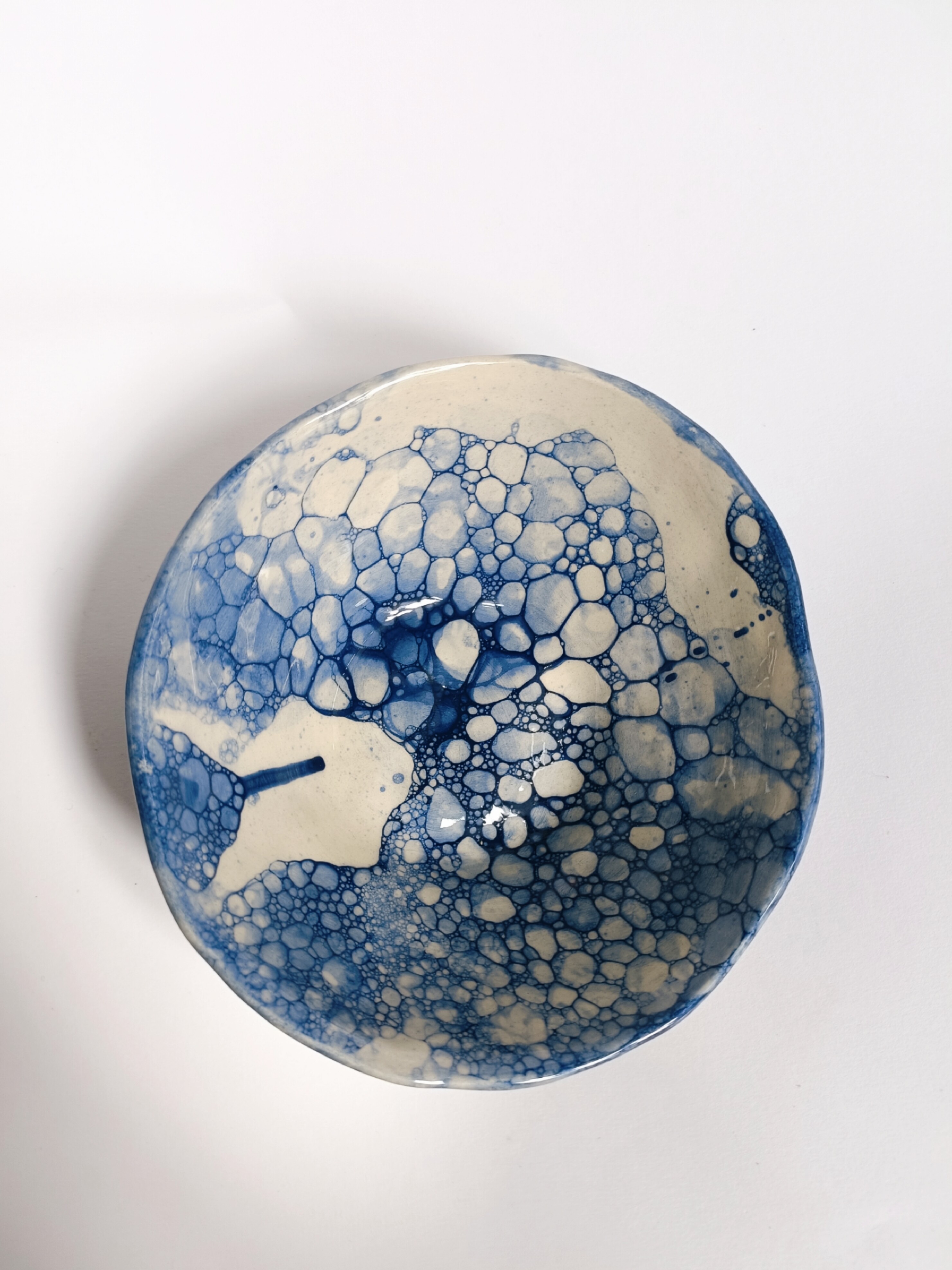 Kamionkowa miseczka z kobaltowym zdobieniem, wykończona błyszczącym szkliwem dopuszczonym do kontaktu z żywnością. Możliwość mycia w zmywarce.