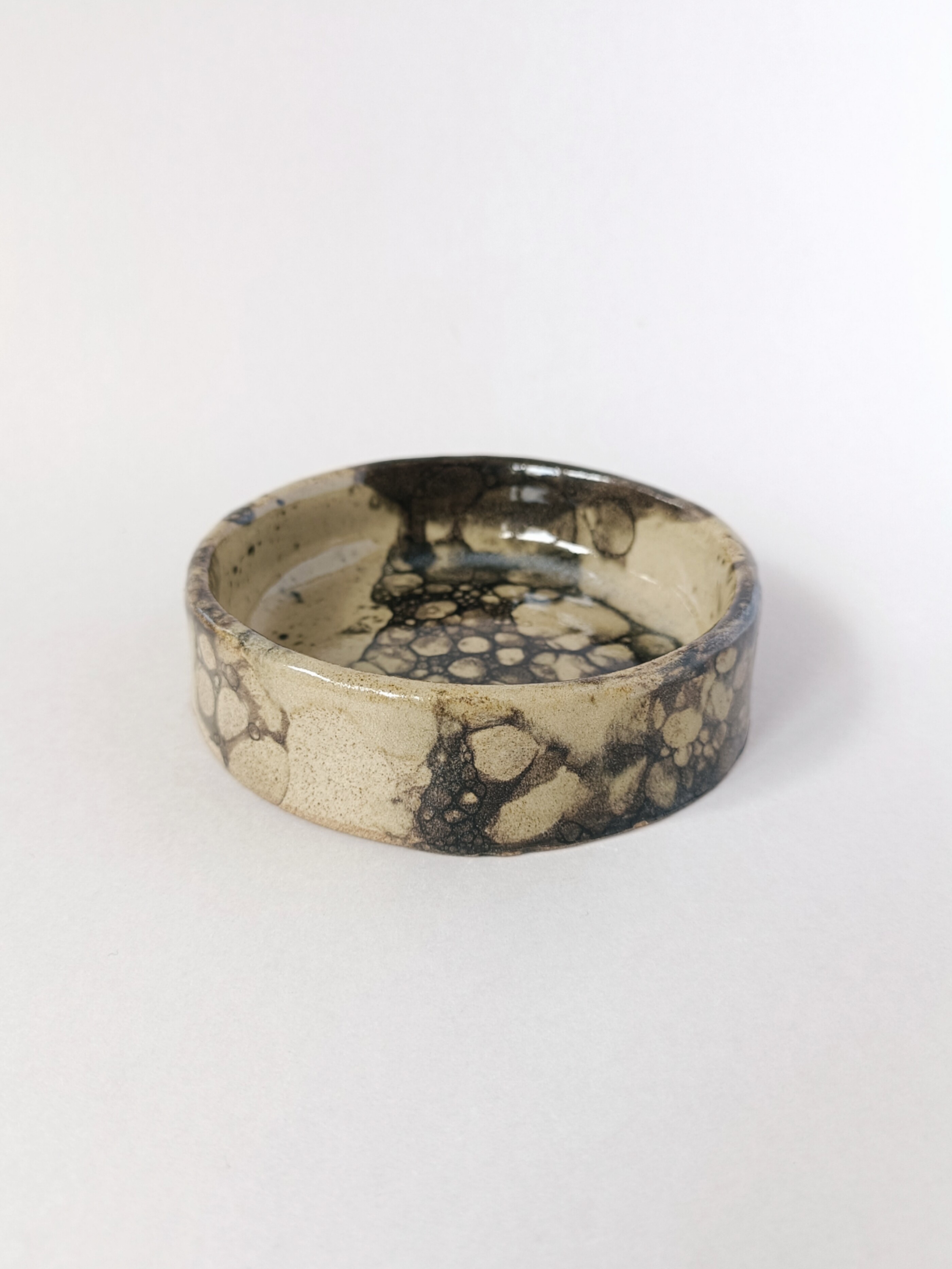 Kamionkowa miseczka z czarnym zdobieniem, wykończona błyszczącym szkliwem dopuszczonym do kontaktu z żywnością. Możliwość mycia w zmywarce.