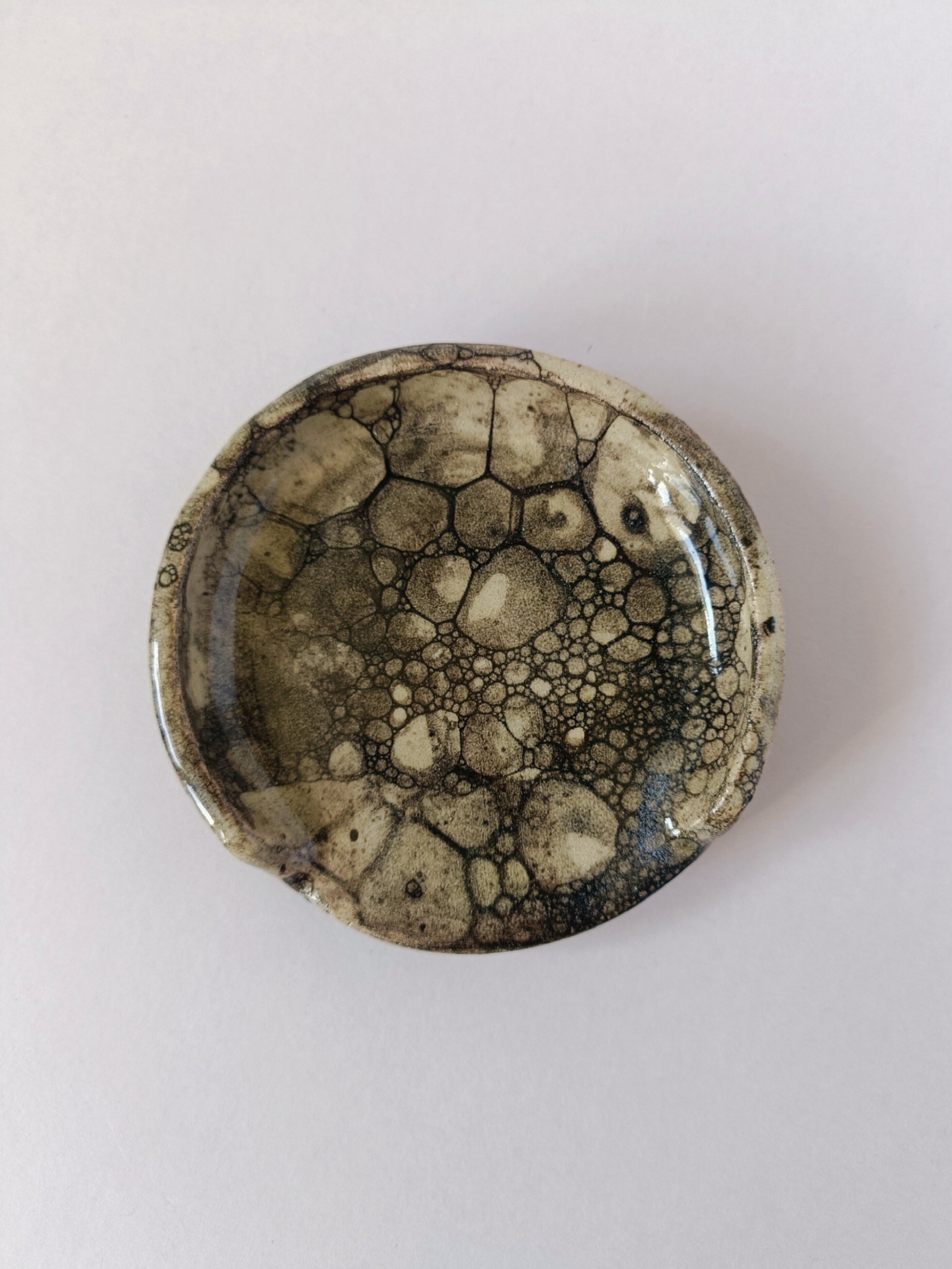 Kamionkowa podkładka pod łyżkę. Ze zdobieniem, wykończona błyszczącym szkliwem odpowiednim do kontaktu z żywnością. Trzy niskie nóżki.