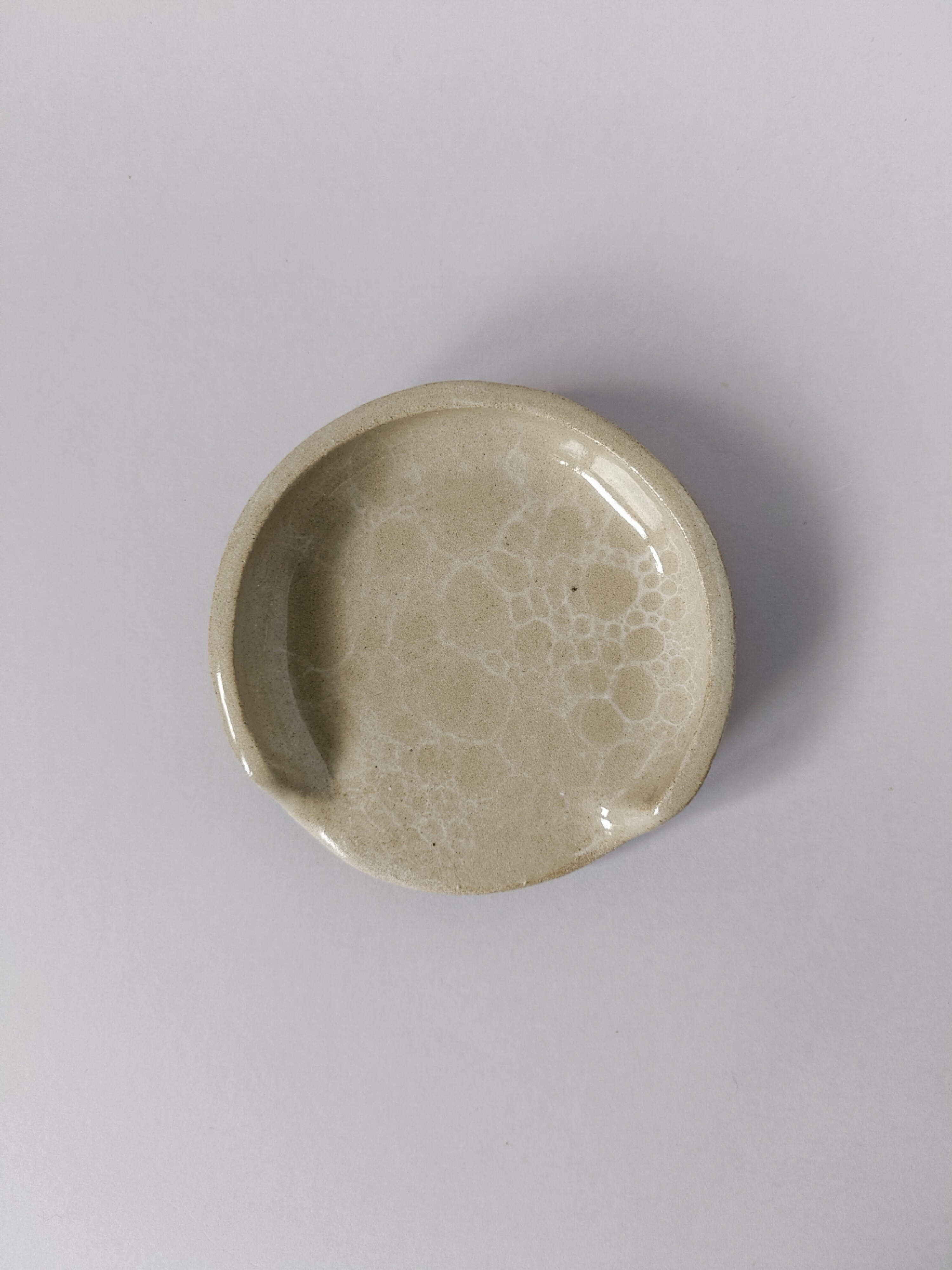 Kamionkowa podkładka pod łyżkę. Ze zdobieniem, wykończona błyszczącym szkliwem odpowiednim do kontaktu z żywnością. Trzy niskie nóżki.
