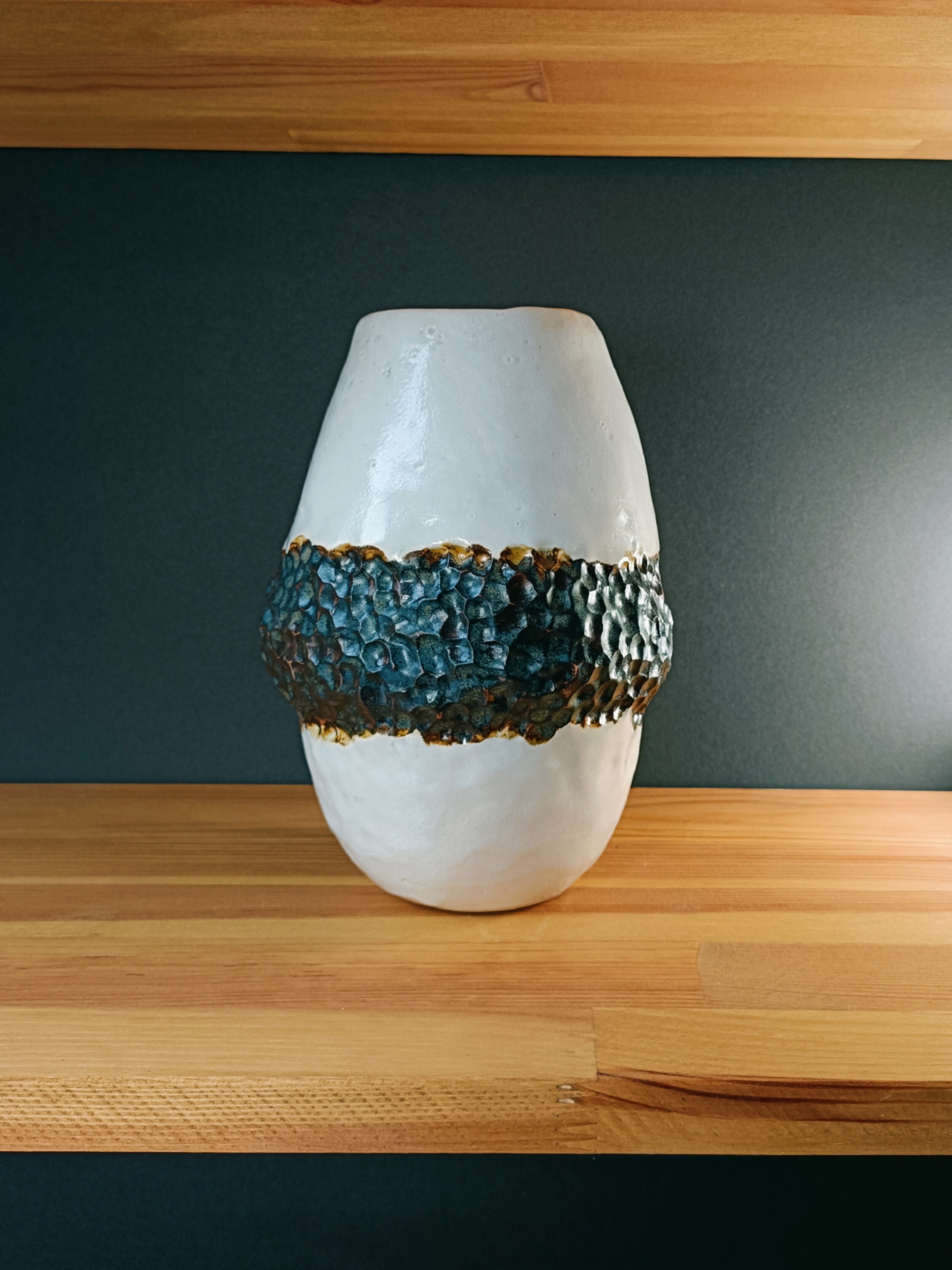 Wazon z kamionki w kolorach bieli i brązu. Odpowiedni zarówno do kompozycji z suchych elementów jak i świeżych roślin wymagających trzymania w wodzie.