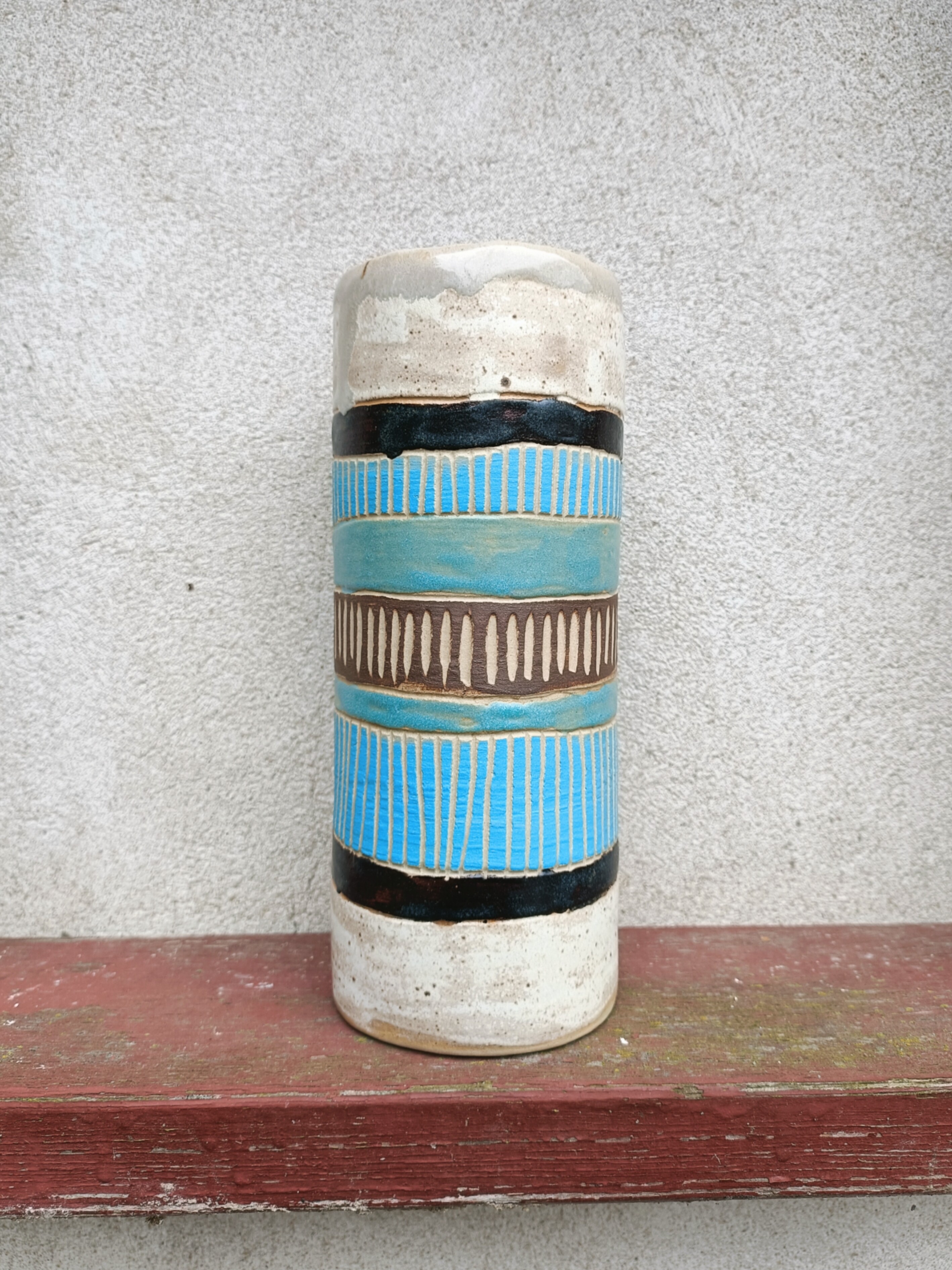 Wazon z kamionki w odcieniach brązu i błękitu. Zdobiony przy użyciu angob techniką sgraffito. Odpowiedni zarówno do kompozycji z suchych elementów jak i świeżych roślin wymagających trzymania w wodzie.
