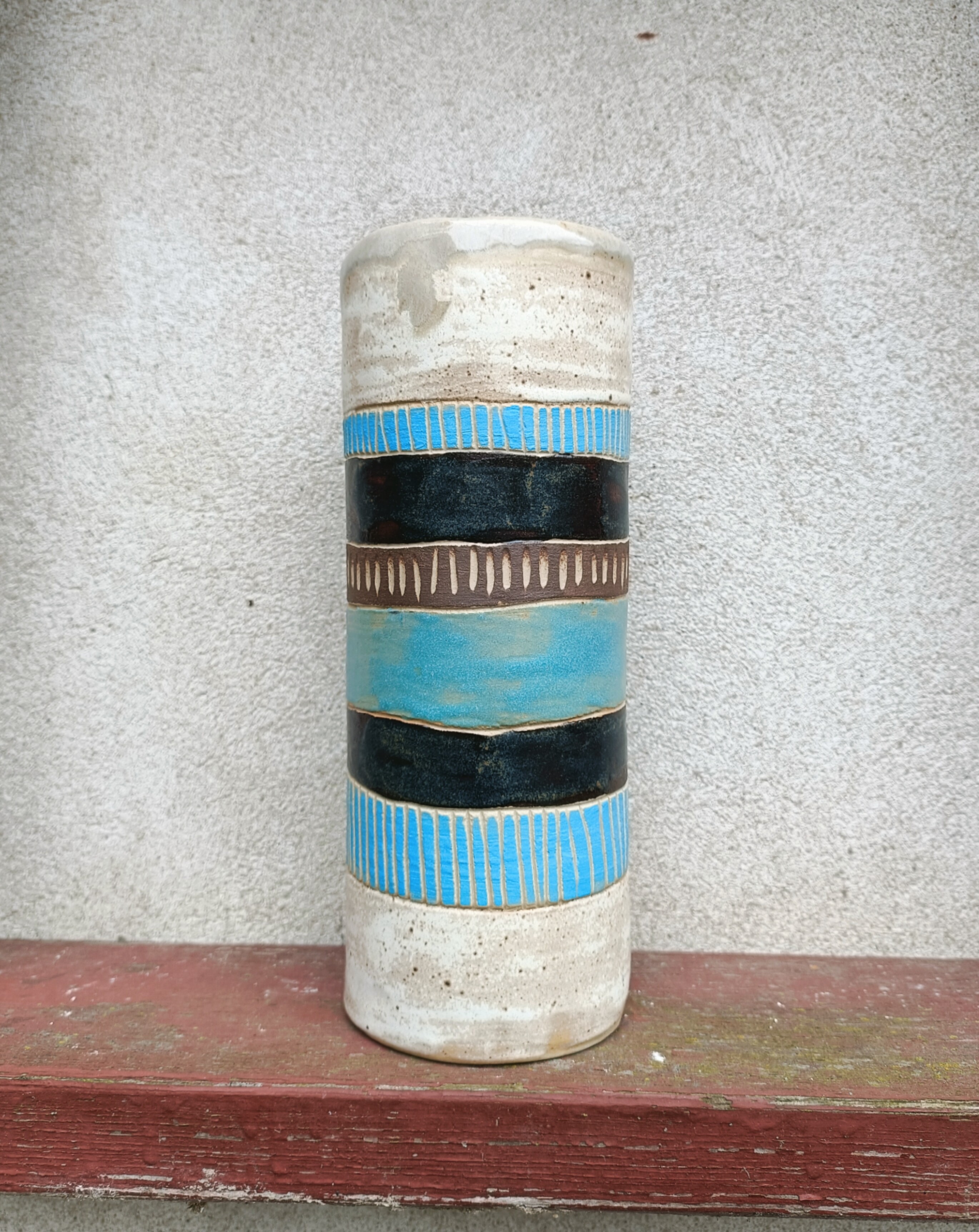 Wazon z kamionki w odcieniach brązu i błękitu. Zdobiony przy użyciu angob techniką sgraffito. Odpowiedni zarówno do kompozycji z suchych elementów jak i świeżych roślin wymagających trzymania w wodzie.