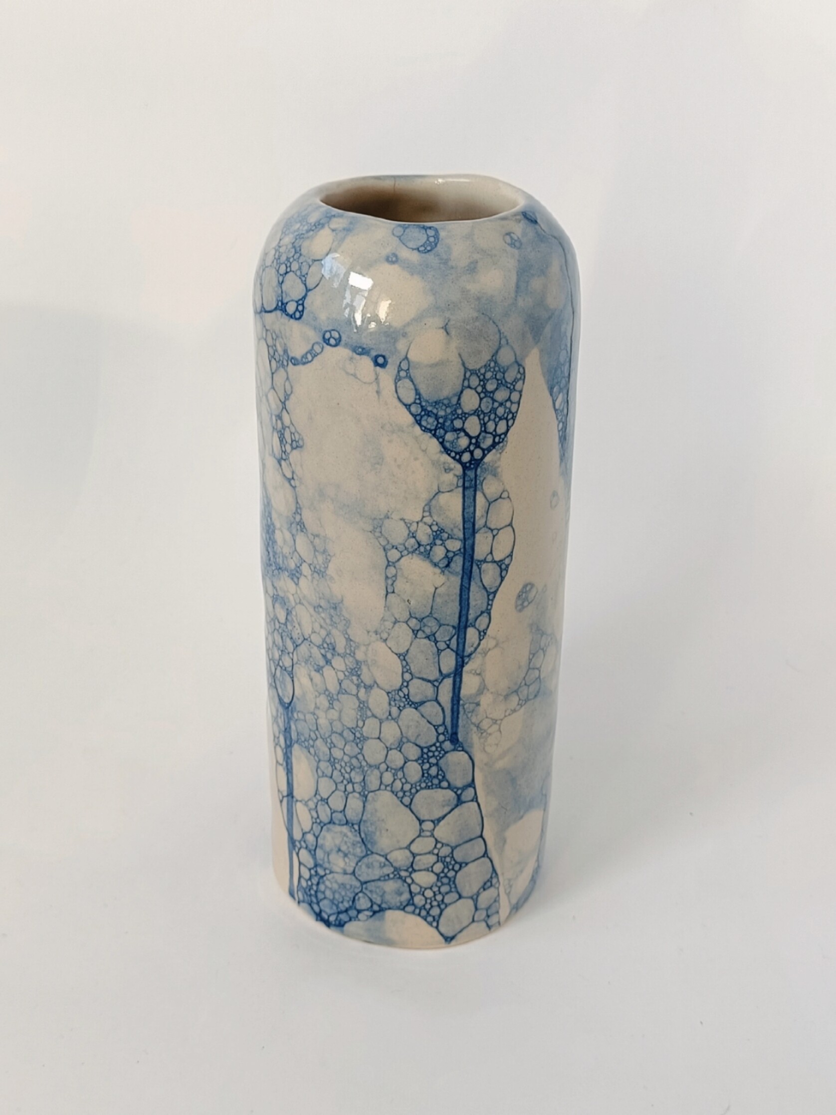 Wazon z kamionki w kolorze surowej gliny z kobaltowym zdobieniem. Wykończony błyszczącym szkliwem transparentnym. Odpowiedni zarówno do kompozycji z suchych elementów jak i świeżych roślin wymagających trzymania w wodzie.